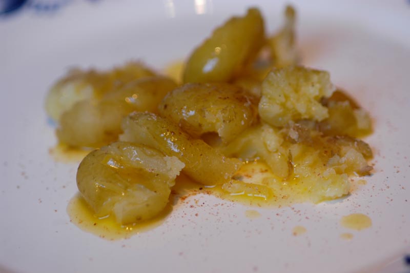Smelt lidt smør i for svag varme og smag til med lidt salt. Hvad? Smage smørsovs til? Ja selvfølgelig, der er forskel på smør, så det skal også smages til. Læg nok til en person af kartoflerne på en tallerken og knus dem blidt med en gaffel. riv en smule muskatnød over – og hæld smørsovsen over. Anret kødet og server.